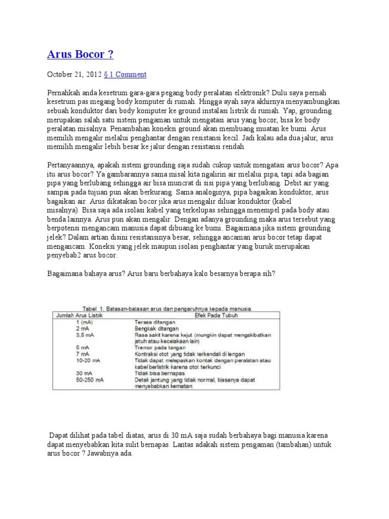 Arus Bocor Ke Bumi - Alat Pelindung Dan Pendawaian : Pembumian bertujuan untuk memberi keselamatan kepada pengguna daripada bahaya renjatan elektrik dan kebakaran apabila arus bocor ke bumi .. Besarnya arus bocor bumi, resiko yang bisa ditimbulkan dan. Untuk lebih jelasnya bisa lihat ulasannya pada "elcb pengaman arus bocor". Kegunaan rccb adalah untuk sejenis pemutus litar automatik yang akan terpelantik dan memutuskan bekalan apabila telah berlaku arus bocor ke bumi yang . Pastikan juga fius atau pemutus litar. Pab mudah alih juga boleh digunakan.